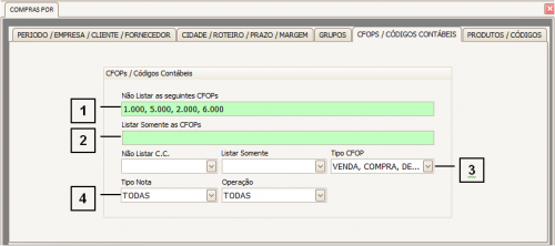 Na aba “CFOPS/Códigos Contábeis” é possível inserir quais CFOPs deseja ou não listar por meio dos seguintes campos: “Não listar as seguintes CFOPs” (1) e “Listar somente as CFOPs” (2).