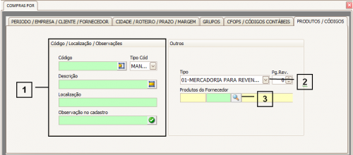 Na aba “Produtos/Códigos” é possível filtrar as informações exibidas no relatório de acordo com o código, descrição, localização ou observação cadastrada no produto comprado (1).