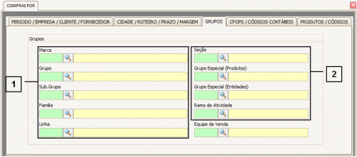 Na aba “Grupos” você pode filtrar as informações exibidas no relatório de acordo com as informações dos produtos comprados (1), assim como por grupos especiais de cadastro (2).