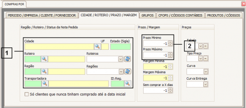 Na aba “Cidade/Roteiro/Prazo/Margem” é possível filtrar o relatório de acordo com as informações de cadastro do fornecedor, como: cidade, roteiro e região que ele faz parte, transportadora ou pelo ID.Reg. que está em seu cadastro (1).