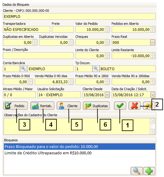 O botão “Duplicatas” (6) exibe informações referentes às últimas vendas realizadas para o cliente em questão.