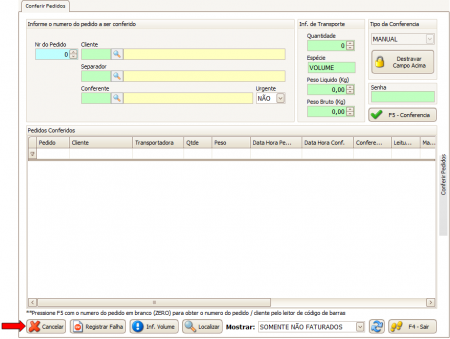 Para cancelar uma Conferência, selecione o pedido conferido e clique em “Cancelar”.