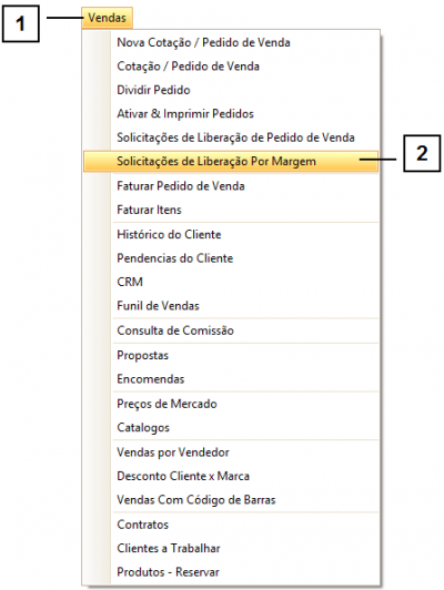 Para acessar a tela de Solicitação de Liberação Por Margem clique em: “Menu Superior”> “Vendas” (1) > “Solicitação de Liberação Por Margem” (2).