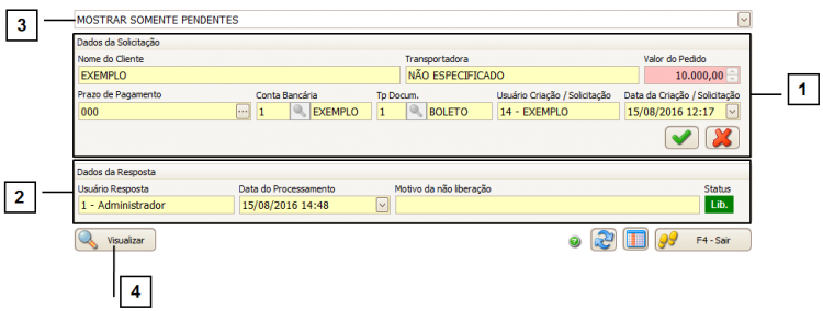 Observação: Quando há solicitações de liberação pendentes de aprovação, um ícone (1) será exibido no rodapé da tela principal do sistema. Ao clicar nesse ícone, a tela de liberação será automaticamente aberta.