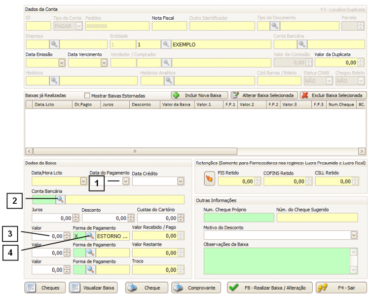 Após ter lançado a conta, deve-se realizar a baixa normal da mesma atentando-se em alguns campos: