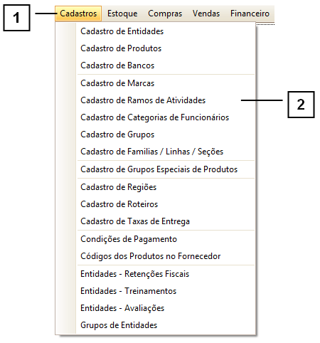 Para acessar a tela Cadastro de Ramos de Atividades clique em: “Menu Superior” > “Cadastros” (1) > “Cadastro de Ramos de Atividades” (2).