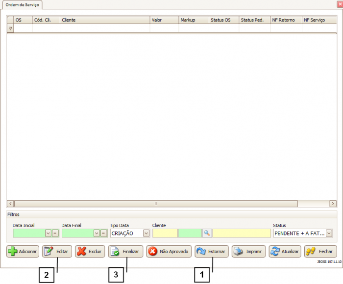 Após ter realizado as alterações confirme novamente a Ordem de Serviço e clique em “Finalizar” (3) para finalizar a OS novamente.