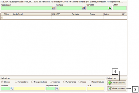 Nesta tela além de localizar um cliente já cadastrado é possível cadastrar um novo cliente através do botão “Novo Cadastro” (1) ou alterar o cadastro selecionado na GRID através do botão “Alterar Cadastro” (2).