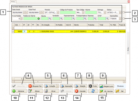 É possível liberar ou bloquear que um pedido seja faturado através dos botões “Liberar Fat.” Ou “Bloquear Fat.” (4), quando o faturamento de um pedido estiver bloqueado a coluna “FT” da GRID estará preenchida com “N”, caso esteja liberado a coluna “FT” estará preenchida com “S”.