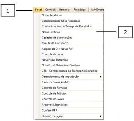 Para realizar uma Contra-Nota, é necessário realizar o lançamento manual de uma Nota Emitida, para isso, acesse a tela de Notas Emitidas: “Menu Superior” > “Fiscal” (1) > “Notas Emitidas” (2).