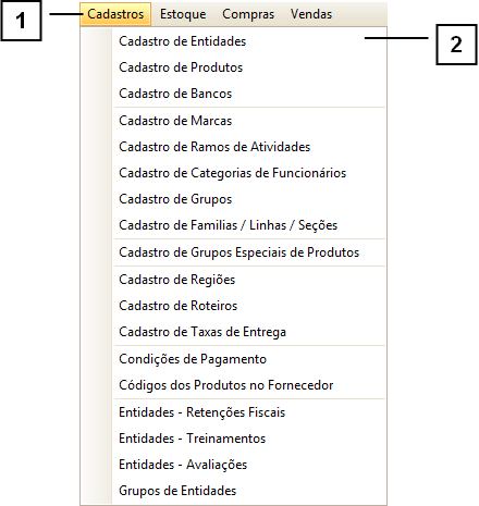 Para acessar a tela de Cadastro de Parentescos clique em: “Menu Superior”> “Cadastros” (1) > “Cadastro de Entidades” (2).