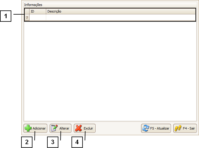 Para adicionar um novo Grau de Parentesco clique em “Adicionar” (2) e informe a “Descrição” na tela que se abrir. Para alterar ou excluir um Grau de Parentesco já cadastrado, selecione-o e clique em “Alterar” (3) ou “Excluir” (4).