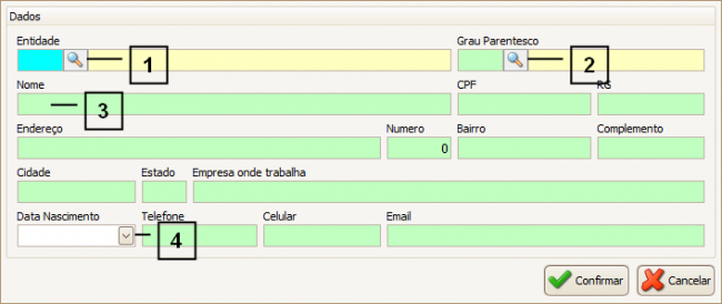 Para adicionar um novo parentesco para uma entidade, existem alguns campos que são de preenchimento obrigatório, são eles: