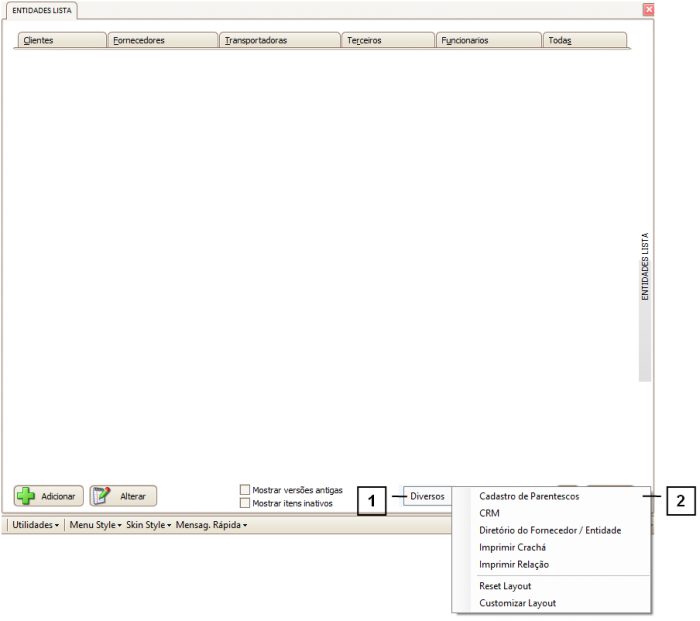 Na tela de Cadastros de Entidades, clique em: “Diversos” (1) > “Cadastro de Parentescos” (2).