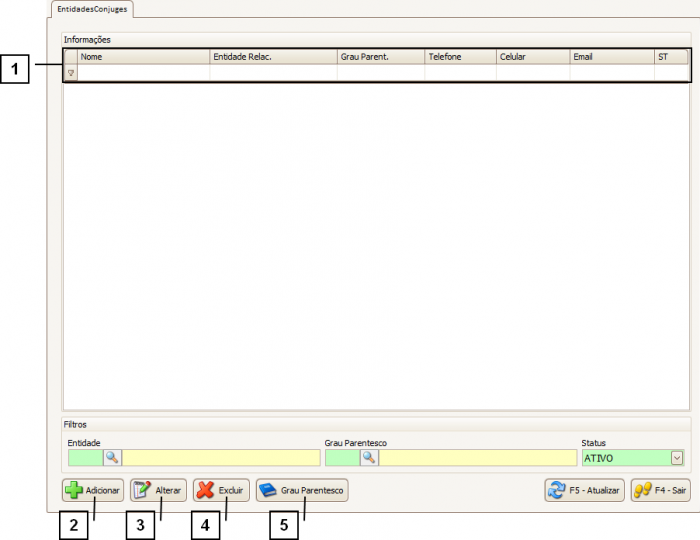 Para adicionar um novo parentesco para uma Entidade, clique em “Adicionar” (2), para alterar ou excluir um parentesco já cadastrado, selecione-o e clique em “Alterar” (3) ou “Excluir” (4), e para adicionar um novo grau de parentesco clique em “Grau de Parentesco” (5).