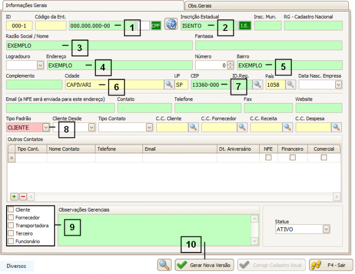 Para confirmar um novo cadastro utilize o botão “Gerar Nova Versão” (10), caso tenha dúvida de como utilizar os botões "Gerar Nova Versão" e "Corrigir Cadastro Atual" consulte o manual de Como utilizar os botões "Gerar Nova Versão" e "Corrigir Cadastro Atual".