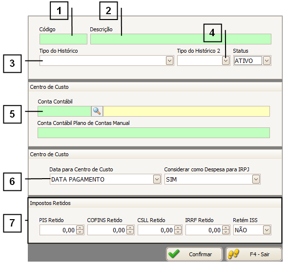 Nota: Apesar desta tela possuir o botão de “Excluir Histórico” (5) e “Excluir Histórico Analítico” (6), não é possível excluir por ser um cadastro utilizado para fechamentos contábeis e outros.