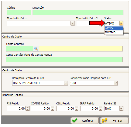 Para Cadastrar um novo Histórico informe o “Código” (1), a “Descrição” (2) e clique em “Confirmar”.