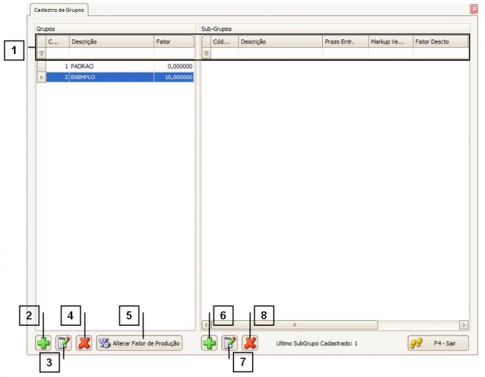 Nesta tela é possível visualizar e/ou filtrar os Grupos e seus Sub-Grupos. Para filtrá-los, utilize os “Campos de Procura” (1). Caso tenha dúvidas de como utilizar os filtros, consulte o manual de "Como utilizar os filtros".