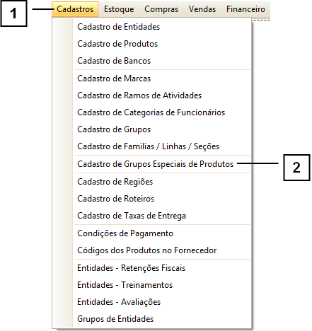 Para acessar a tela de Cadastro de Grupos Especiais de Produtos clique em: “Menu Superior”> “Cadastros” (1) > “Cadastro de Grupos Especiais de Produtos” (2).