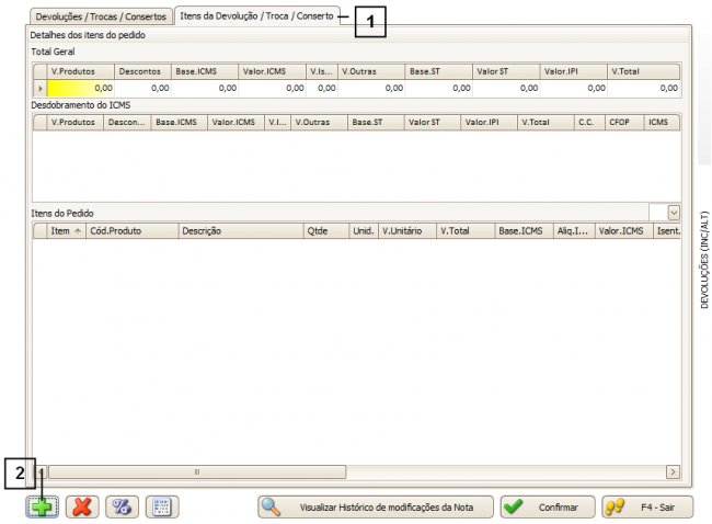 Na aba “Itens da Devolução / Troca / Conserto” (1), clique em “Adicionar” (2).