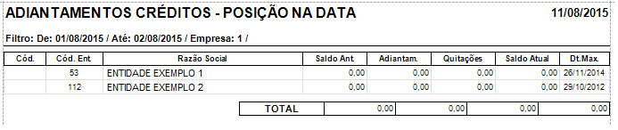 A imagem a seguir mostra um modelo do relatório de “Créditos – Posição na Data”.