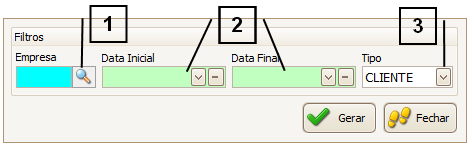 Para isso, informe a “Empresa” (1), a “Data Inicial” e a “Data Final” (2) e o “Tipo” (3).