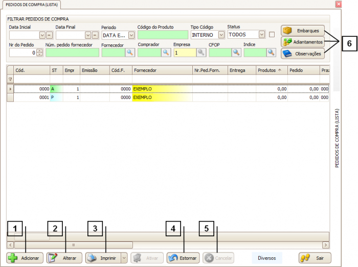 Na tela de Pedido de Compra possui os botões de “Embarques”, “Adiantamentos” e “Observações” (6), para saber mais sobre cada botão consulte os manuais disponíveis, “Como utilizar o botão de Embarques”, “Como utilizar o botão de Adiantamentos” ou “Como utilizar o botão de Observações”.
