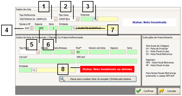 Se a Nota existir no sistema, o campo “Status” (8) será preenchido com “Nota Encontrada”.