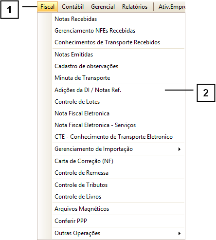 Para acessar a tela de Notas Referenciadas clique em: “Menu Superior”> “Fiscal” (1) > “Adições da DI / Notas Ref.” (2).