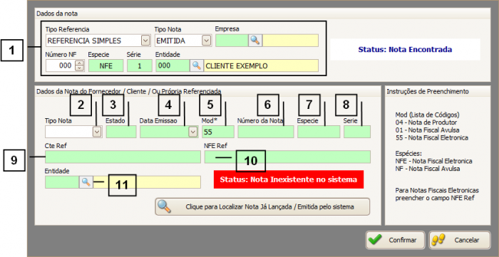 Para efetuar a devolução de uma Nota não lançada no sistema, é preciso inserir manualmente os dados referentes a essa Nota. Para isso, alguns campos são de preenchimento obrigatório, são eles: