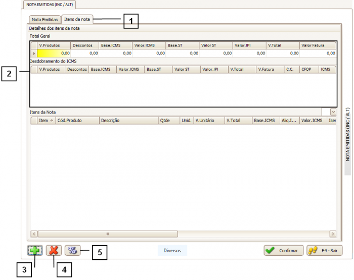 A aba “Itens da Nota” (1) é utilizada para visualizar os itens que compõe a nota e seus valores.