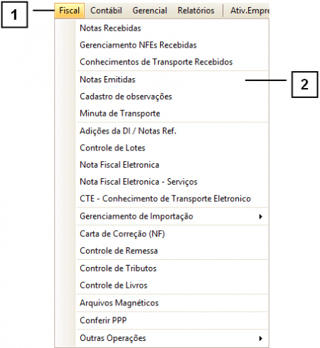 Para acessar a tela de Notas Emitidas clique em: “Menu Superior”> “Fiscal” (1) > “Notas Emitidas” (2).