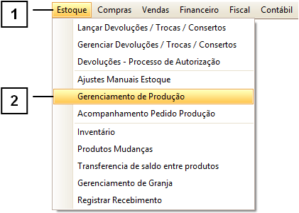 Para acessar a tela de lançamento de produção clique em: “Menu Superior”, clique em “Estoque” (1) > “Gerenciamento de Produção” (2).