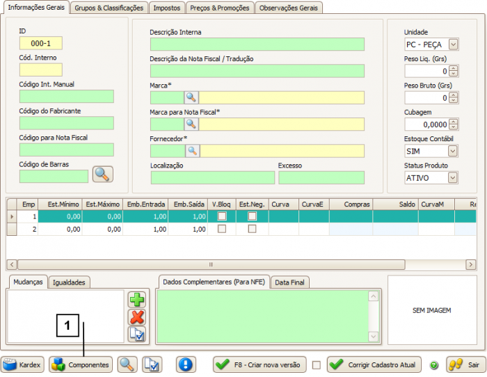 A tela de componentes poderá ser acessada de duas maneiras, a primeira maneira é através da tela de cadastro do produto, clicando no botão “Componentes” (1).
