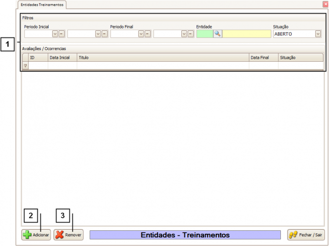Ao abrir a tela Entidades - Treinamentos, o sistema por padrão não realiza nenhum “Filtro” (1). Caso tenha dúvidas de como utilizar os filtros, consulte o manual de "Como utilizar os filtros".
