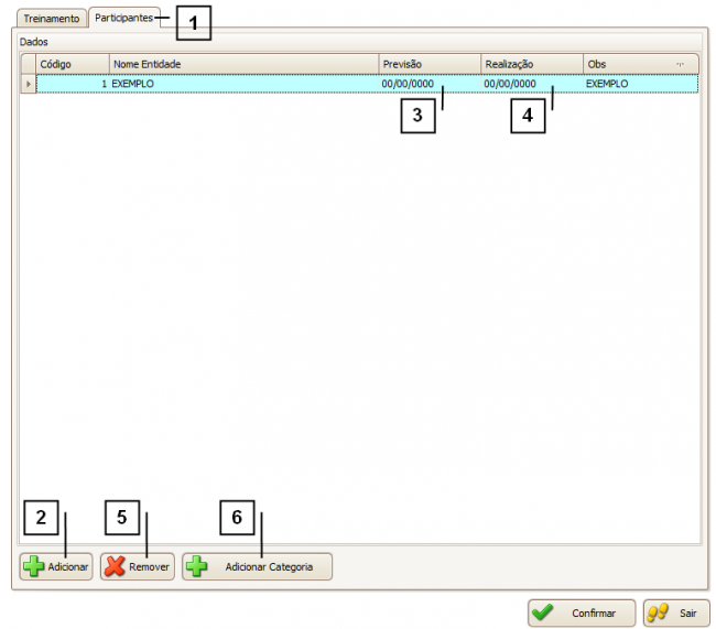 Para adicionar um participante, clique em “Adicionar” (2) e informe a Entidade desejada, também poderá informar a data prevista (3) para que a entidade realize o treinamento (depois poderá emitir relatórios utilizando este campo), bem como a data que o treinamento foi realizado (4).