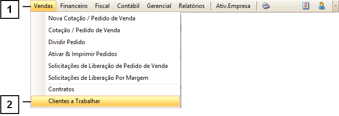 No “Menu Inicial”, clique em “Vendas” (1) > “Clientes a Trabalhar” (2).
