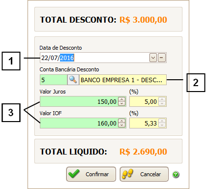 Informe no campo “Data de Desconto” (1) a data em que o valor entrou em sua conta bancária.