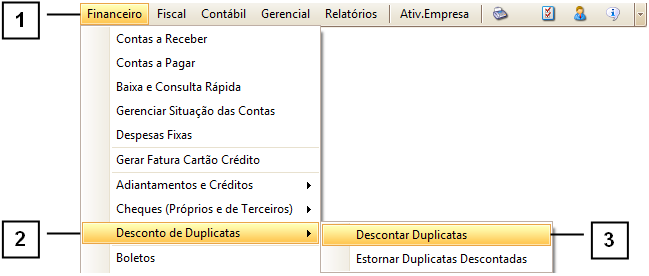 Para acessar a tela de “Desconto de Duplicatas” clique em: “Menu Superior” > “Financeiro” (1) > “Desconto de Duplicatas” (2) > “Descontar Duplicatas” (3).