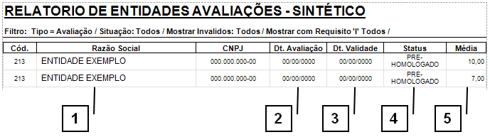 A imagem a seguir mostra um modelo do Relatório de Entidades Avaliação Sintético.