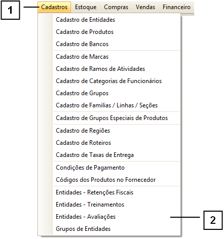 Para acessar a tela de Cadastro de Entidades - Avaliações clique em: “Menu Superior”> “Cadastros” (1) > “Entidades - Avaliações” (2).