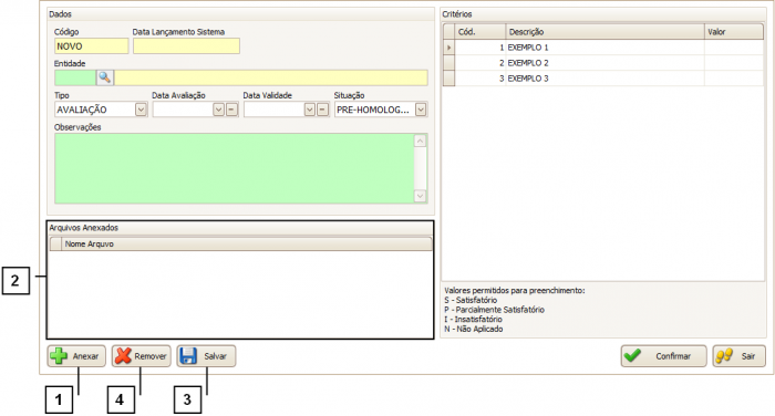 Para adicionar uma nova avaliação informe a “Entidade” (1) que deseja avaliar, a “Data da Avaliação” (2) e a “Data de Validade” (3).