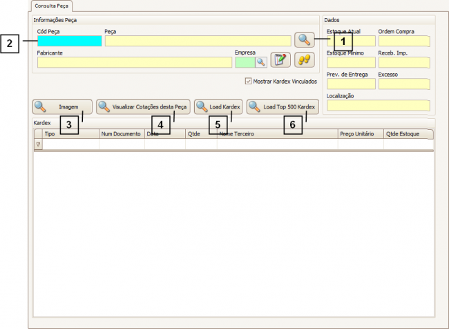 Depois de selecionado o Produto, é possível visualizar sua Imagem (3), Últimas Cotações (4), o Kardex completo (5), ou somente as últimas 500 movimentações do Kardex (6).