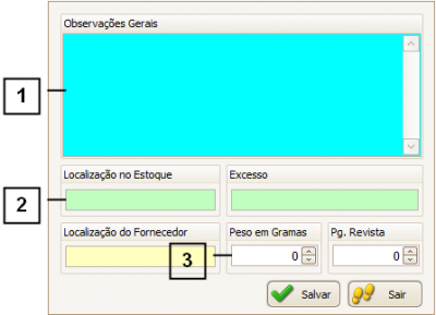 Na tela que se abrir, poderá ser informado as “Observações Gerais” (1) da peça, a “Localização no Estoque” (2), e o “Peso em Gramas” (3).