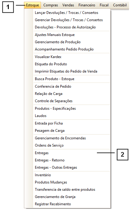 Para acessar a tela de Entregas clique em: “Menu Superior” > “Estoque” (1) > “Entregas” (2).