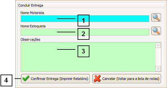 A seguinte tela se abrirá. Nela informe o “Nome do Motorista” (1), “Nome do Estoquista” (2), as “Observações” (3) e confirme.
