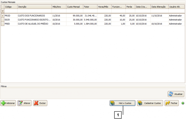 Para vincular um custo mensal a um histórico analítico clique em “Hist x Custos” (1).