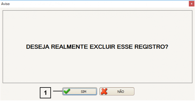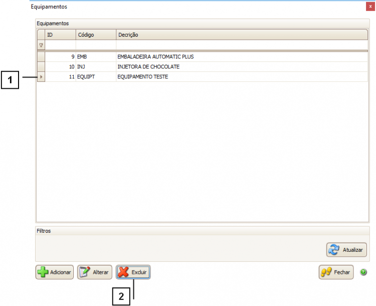 Para excluir algum item, selecione o item na grid (1), clique em excluir (2) e confirme a exclusão.