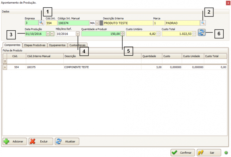Ao clicar no botão atualizar (6) serão carregadas as informações cadastradas no Cadastro de Ficha de Produto, (clique aqui para saber mais sobre Cadastro de Ficha de Produto) calculando assim o custo dessa produção.